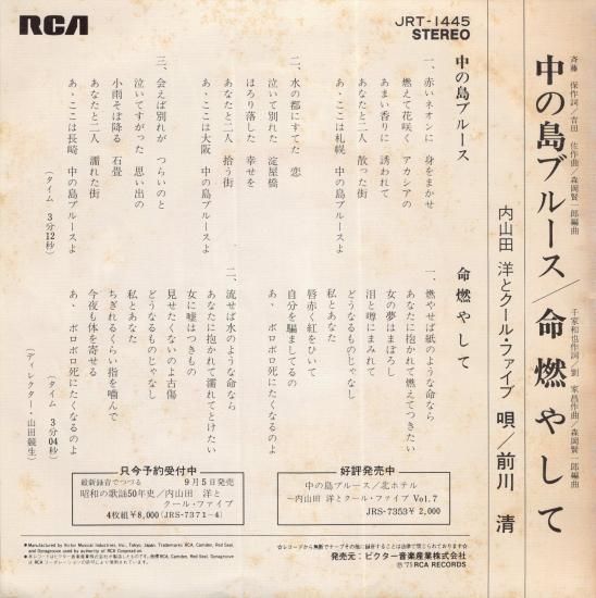 中の島ブルース/命燃やして [EP盤] 内山田洋とクールファイブ,前川清 JRT-1445 中古品-良い